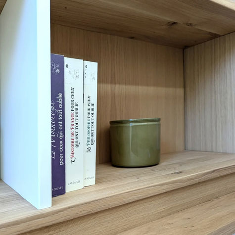 Dans la continuité de cette chambre double, le palier a été pensé comme une salle de lecture et d'études, bénéficiant d'un garde-corps bibliothèque - accessible en recto verso pour attraper un livre sur la route vers le rez-de-chaussée.